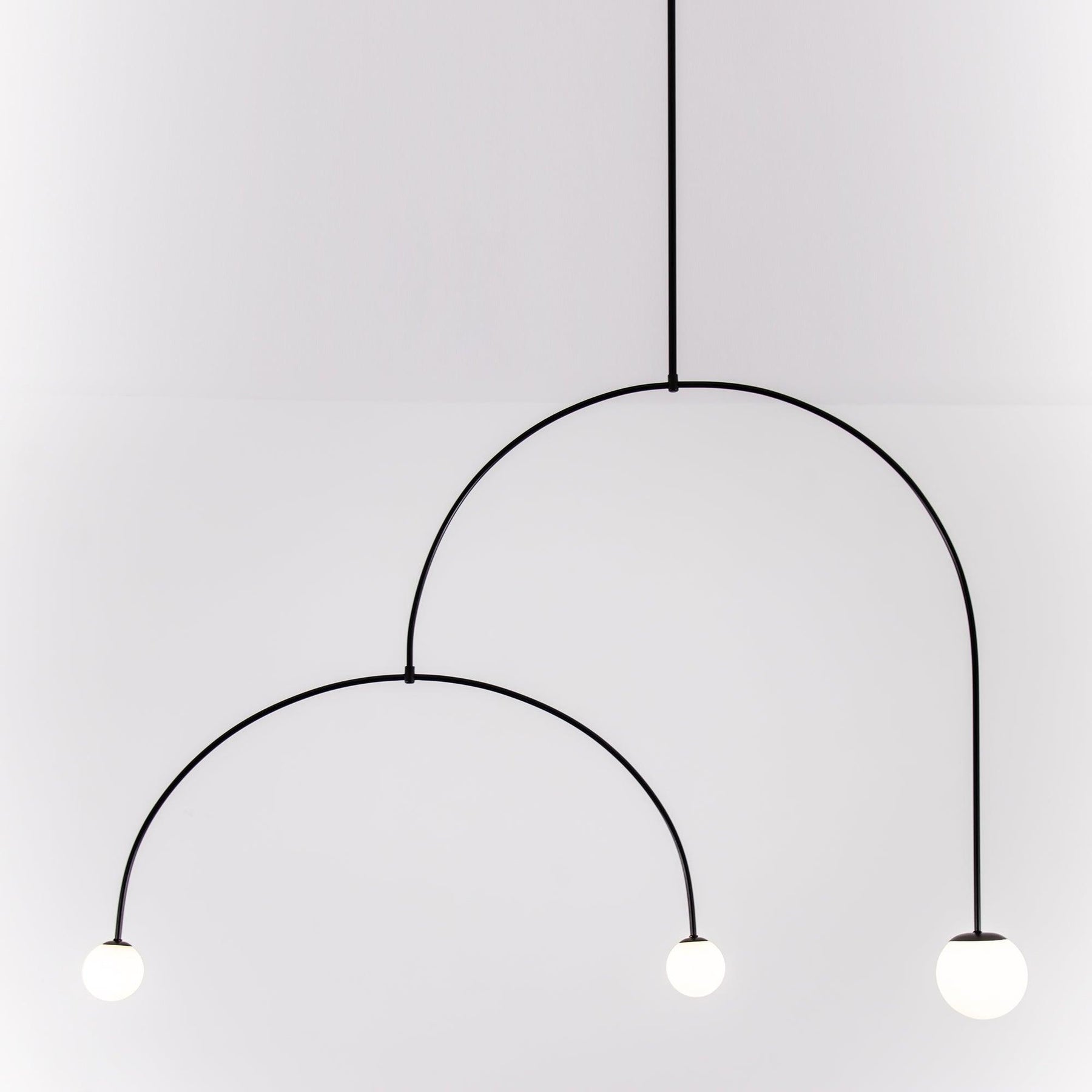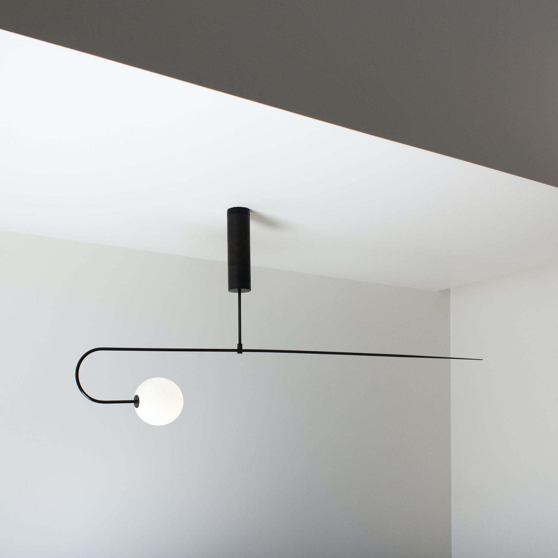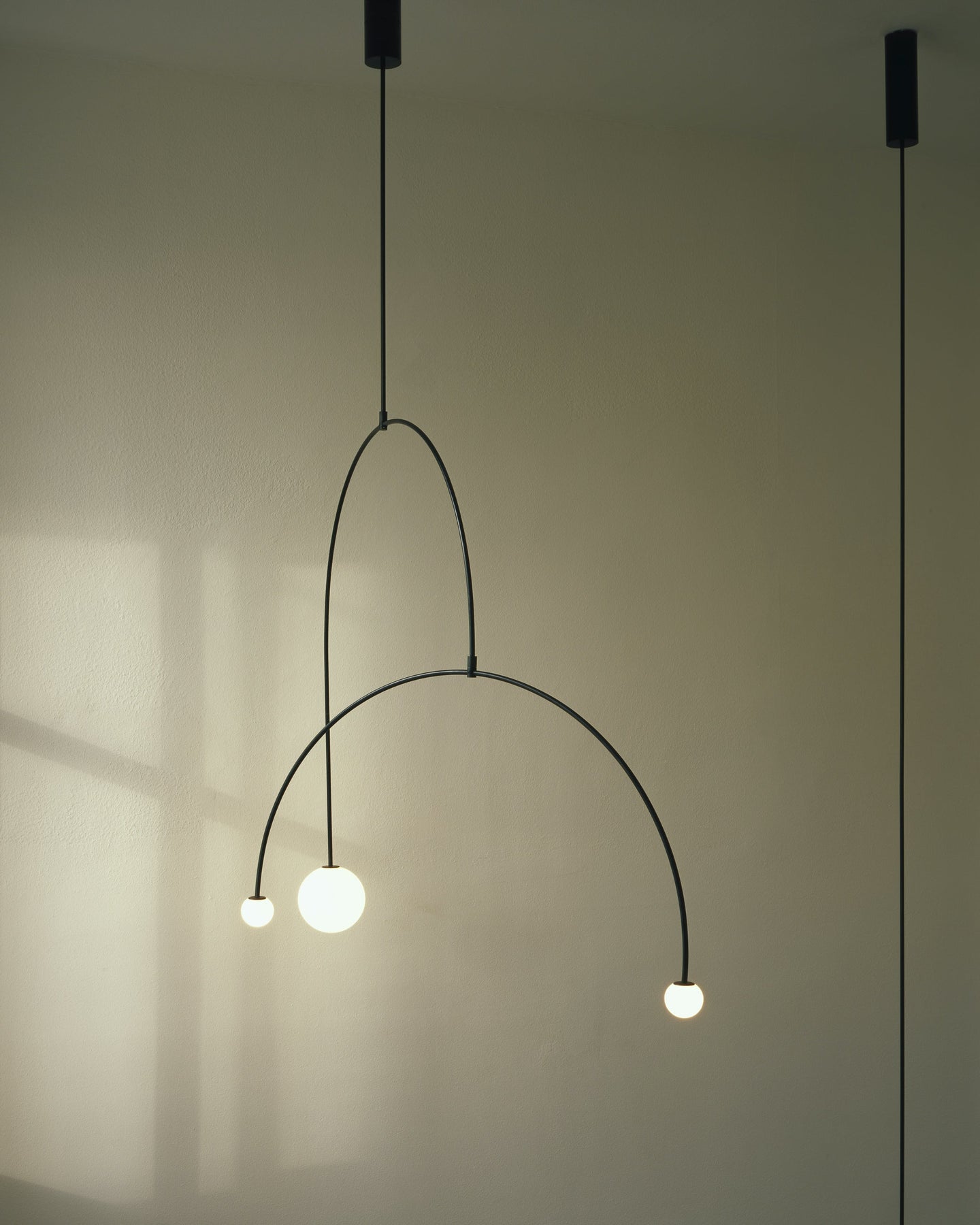 Een grafisch lijnenspel van metaal en glas, dat rust en verfijning brengt in moderne interieurs. De minimalistische opbouw en opaalglazen diffusers zorgen voor warme, verspreide verlichting in een luchtige compositie. Uitermate geschikt voor de woonkamer, vide of eetruimte.