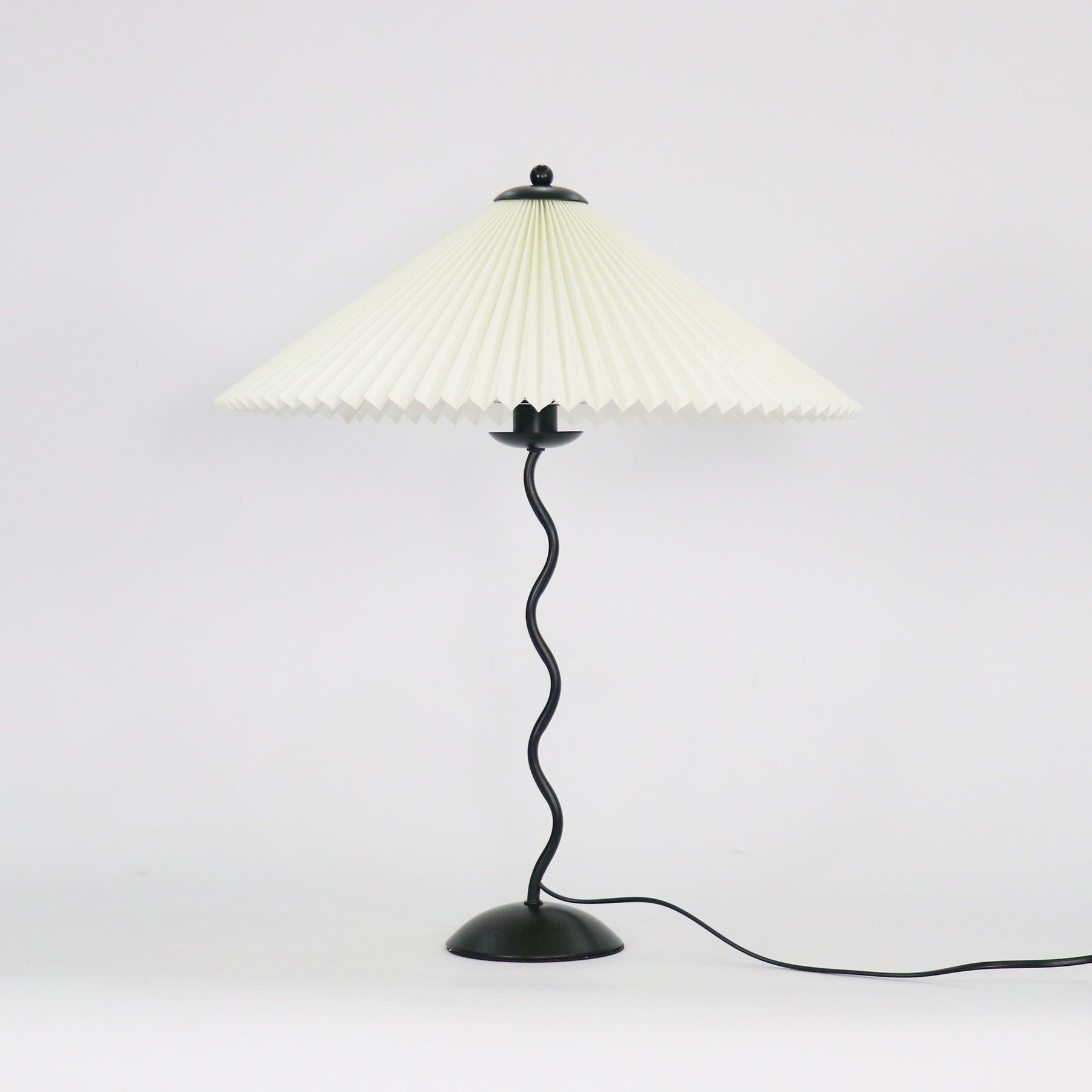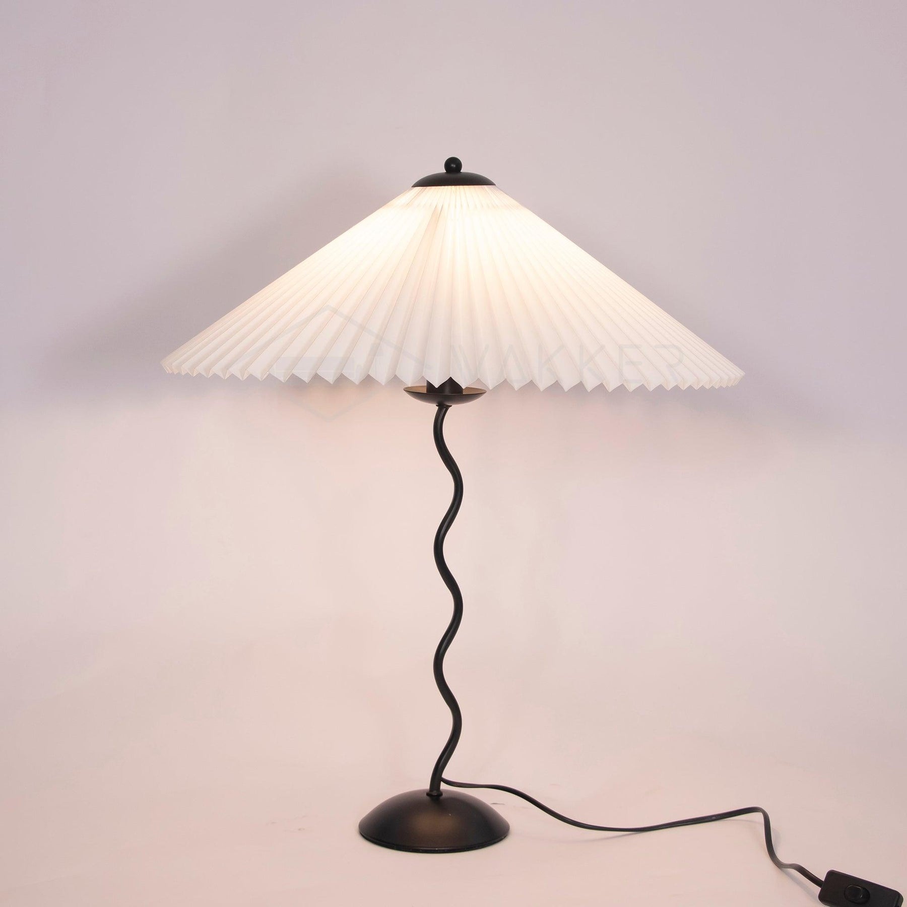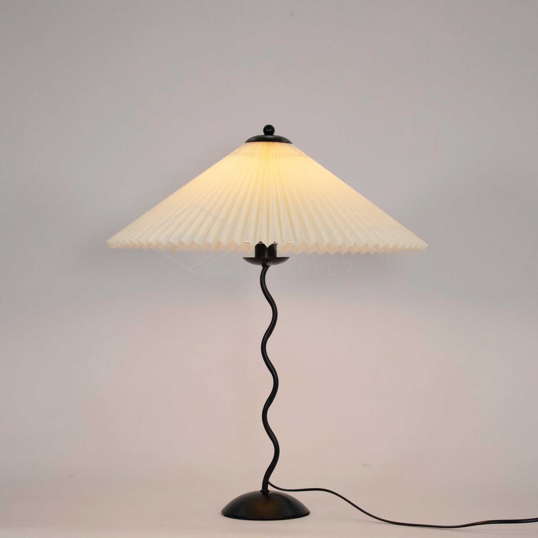 Een charmante en sierlijke lamp die karakter en zachtheid toevoegt aan elk interieur. De geplooide kap in combinatie met de gebogen golvende voet brengt een speels lijnenspel dat rust en verfijning uitstraalt. Ideaal voor op een dressoir, bijzettafel of nachtkastje.