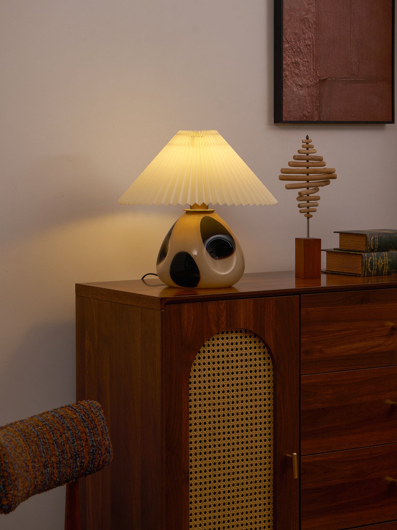 Deze sfeervolle tafellamp combineert een nostalgisch ontwerp met een zachte, warme uitstraling. De plooien in de stoffen kap zorgen voor een subtiel spel van licht en schaduw, terwijl de zwarte voet een stijlvol contrast biedt. De lamp brengt rust en karakter in elke ruimte.
